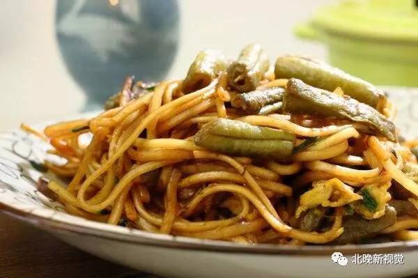 扁豆撅成段煸好(喜欢荤的就加肉丝);把切好的手擀面码在蒸锅里,大点儿火蒸熟(别忘了点酱油)。吃的时候可以点点儿醋,别有风味。