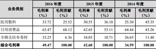 稳健医疗2014年-2016年各主营业务毛利情况,其中“日用消费品”即指全棉时代产品。