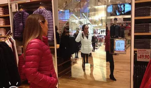 那再说说线下的虚拟试穿吧,相比较这个是有点“技术含量”的。但目前国内基本上没有,但优衣库去年在美国圣地亚哥的一家门店试推行了这个玩法,顾客穿一件优衣库的单品,就能够在AR巨大显示屏跟前切换该产品的不同颜色。