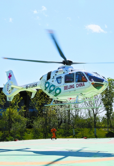 ◀999医疗服务直升机从会场外的停机坪起飞,参与“一带一路”国际合作高峰论坛全要素应急救援演练。
