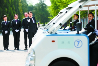 ▲为保证“一带一路”国际合作高峰论坛元首配偶文化活动的圆满成功,负责转场服务的电瓶车驾驶员们抓紧最后几天时间强化技能。 |