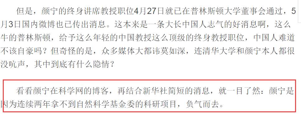 文中直接指出颜宁去普林斯顿的原因,竟然是因为连续两年拿不到自然科学基金委的科研项目,负气而去。