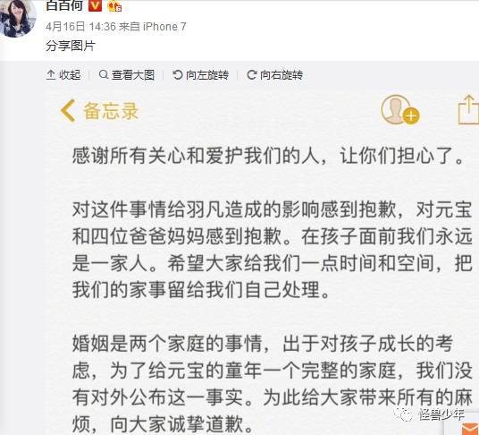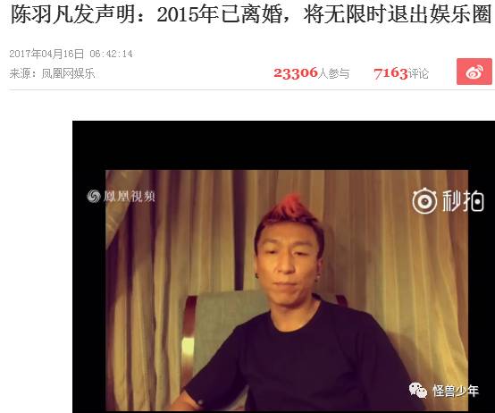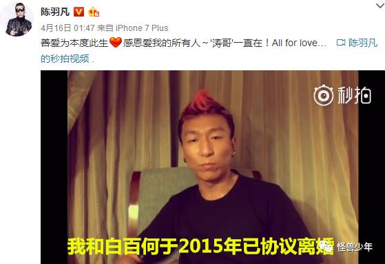 而在上个月16号,白百何出轨曝光后的第4天,陈羽凡在凌晨先录制视频说他与白百何在2015年已经协议离婚。(今天又说戴绿帽,所以……)
