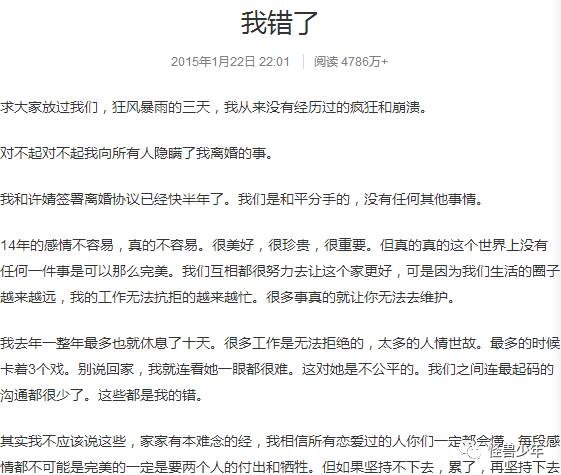 陈赫在2015年1月深陷“出轨风波”,当时一篇《我错了》让网友目瞪口呆。