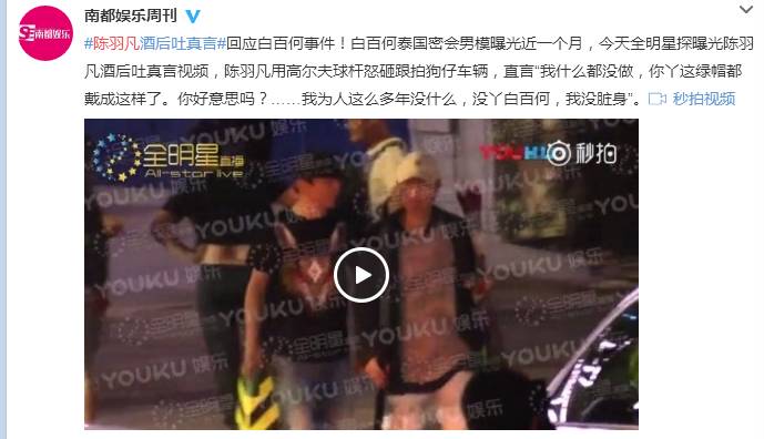 今天下午,全明星探曝光陈羽凡深夜KTV买醉,喝醉后发现记者跟拍,上前挥杆砸车,并酒后吐真言:“没丫白百何我没有脏身儿,我什么都没做,绿帽子被媳妇戴成这样!”