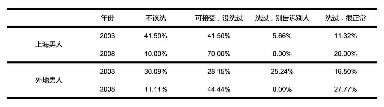 张结海认为,从上表可以看出:无论是实际情况还是变化趋势,外地男人比上海男人更接受为老婆(女友)洗内裤。
