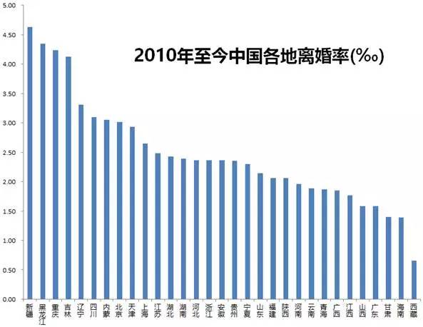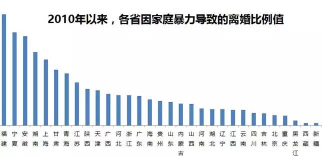 至于为什么家暴离婚案件少,是因为这两个地区的离婚率本就是异常数据:新疆是全国最高,西藏是全国最低,这其中主要因素是民族因素,比如新疆的婚姻特点是“换得勤”,西藏的婚姻特点是“不领证”(鉴于民族原因也就不展开说了)。总之,图中新疆和西藏的数据为无效数据,可以排除。