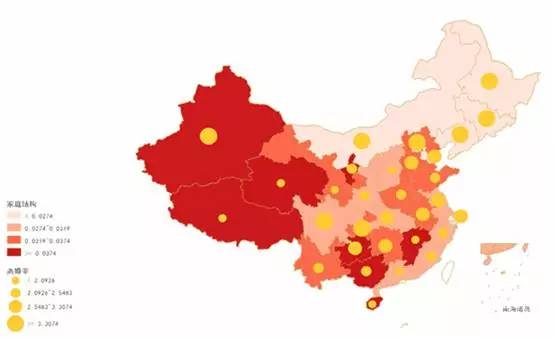 图中颜色越深的地区,家庭结构越复杂,颜色浅则相反。圆点越大的地区,离婚率越高,反之同理。可以发现除了新疆这个奇葩地区外,家庭结构与离婚率是严格成反比的——家里人越多,老人孩子越多,则夫妻双方离婚的阻力就越大,就越难离婚。这一点在广东潮汕地区最为明显。