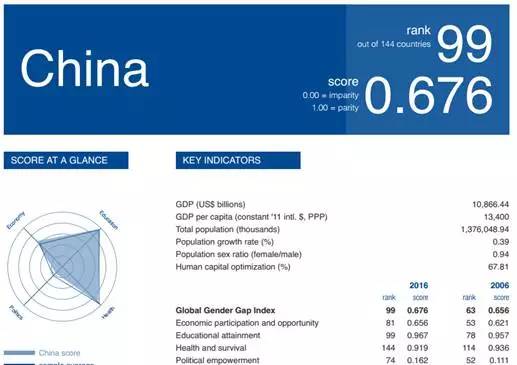 以最新发布的《2016全球性别差距报告》为例,中国排名全球第99位,可以说惨不忍睹。如果细看各项评分,可以发现中国在“经济参与机会”(81名)、“政治赋权”(74名)等领域做得并没这么差,为什么会被评到第99名呢?