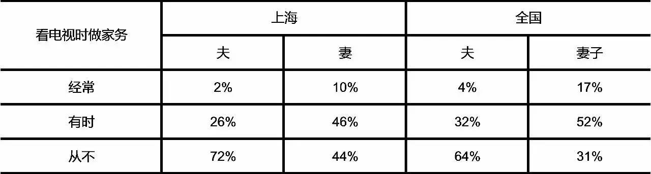 张结海的女同事,上海社会科学院社会学研究所研究员徐安琪也持同样的观点。在其撰写的《女性的家务贡献和社会地位——兼评上海“围裙丈夫”、“妻管严”的定性误导》一文中,使用了一个比“洗内裤”更含蓄,但也同样能说明问题的数据:上海和全国夫妻在看电视时兼做家务的性别差异。