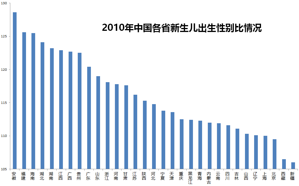 (注:新生儿性别比的含义是,每出生100个女孩,会出生X个男孩,如安徽是将近出生130个男孩)