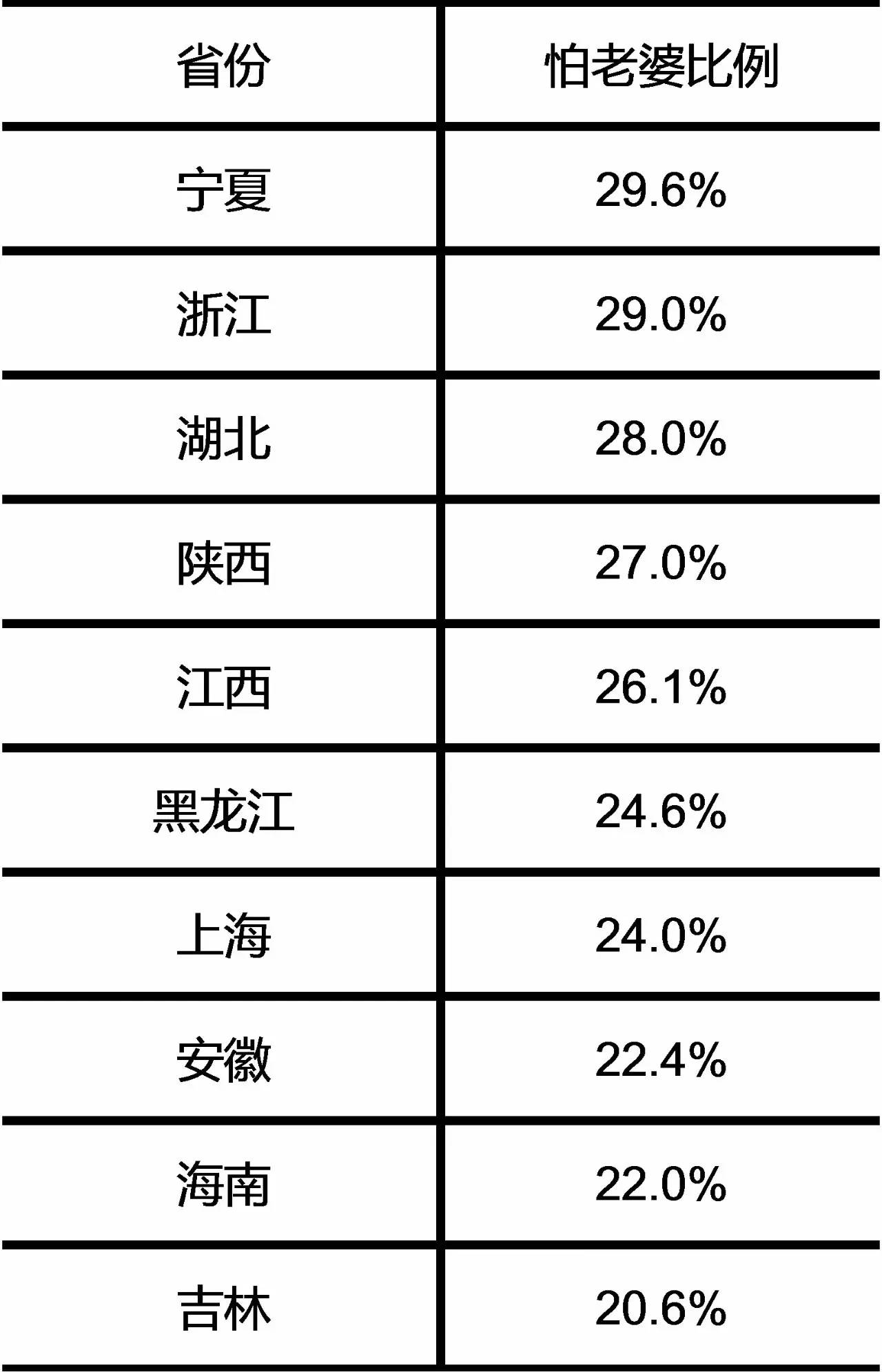 2015年3月,老牌调查公司零点调查进行了一项针对全国36个城市的入户调查,并制作了名为“全国怕老婆排行榜”的榜单。在此节选前十省份。