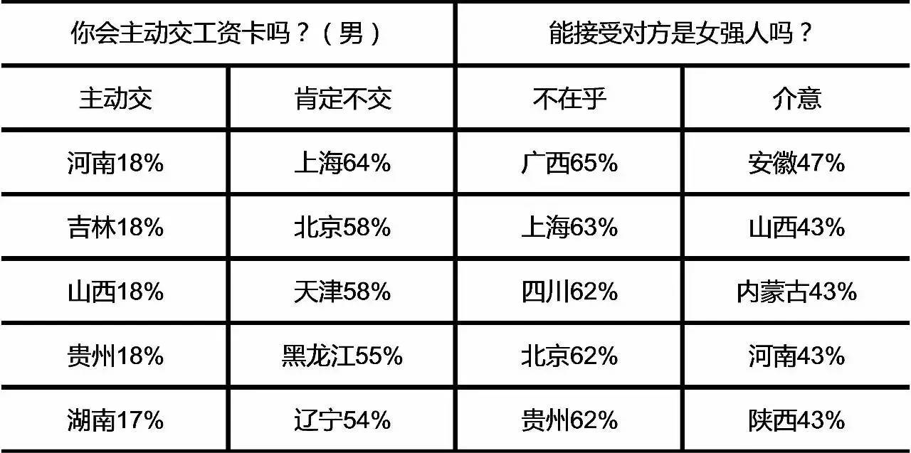 虽然数据样本令人疑惑(毕竟这个网站的用户类型比较相近),但这份数据其实从另一个侧面再次为上海男人进行了辩护,在肯定不交工资卡的排名中,上海男人以64%的绝对优势领跑全国。至于其它数据则显得杂乱无章。