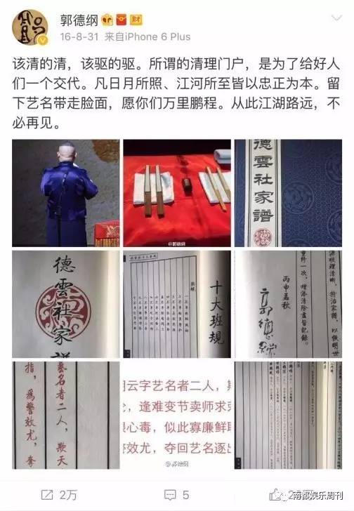 先简单回顾下,相信很多吃瓜群众犹记得,去年夏末秋初,郭德纲晒德云家谱清理门户事件;