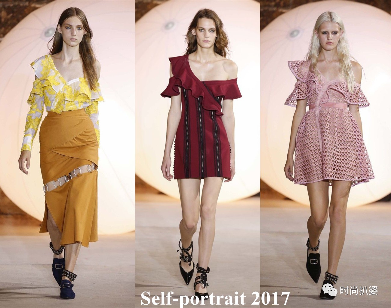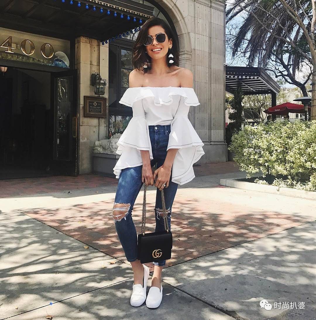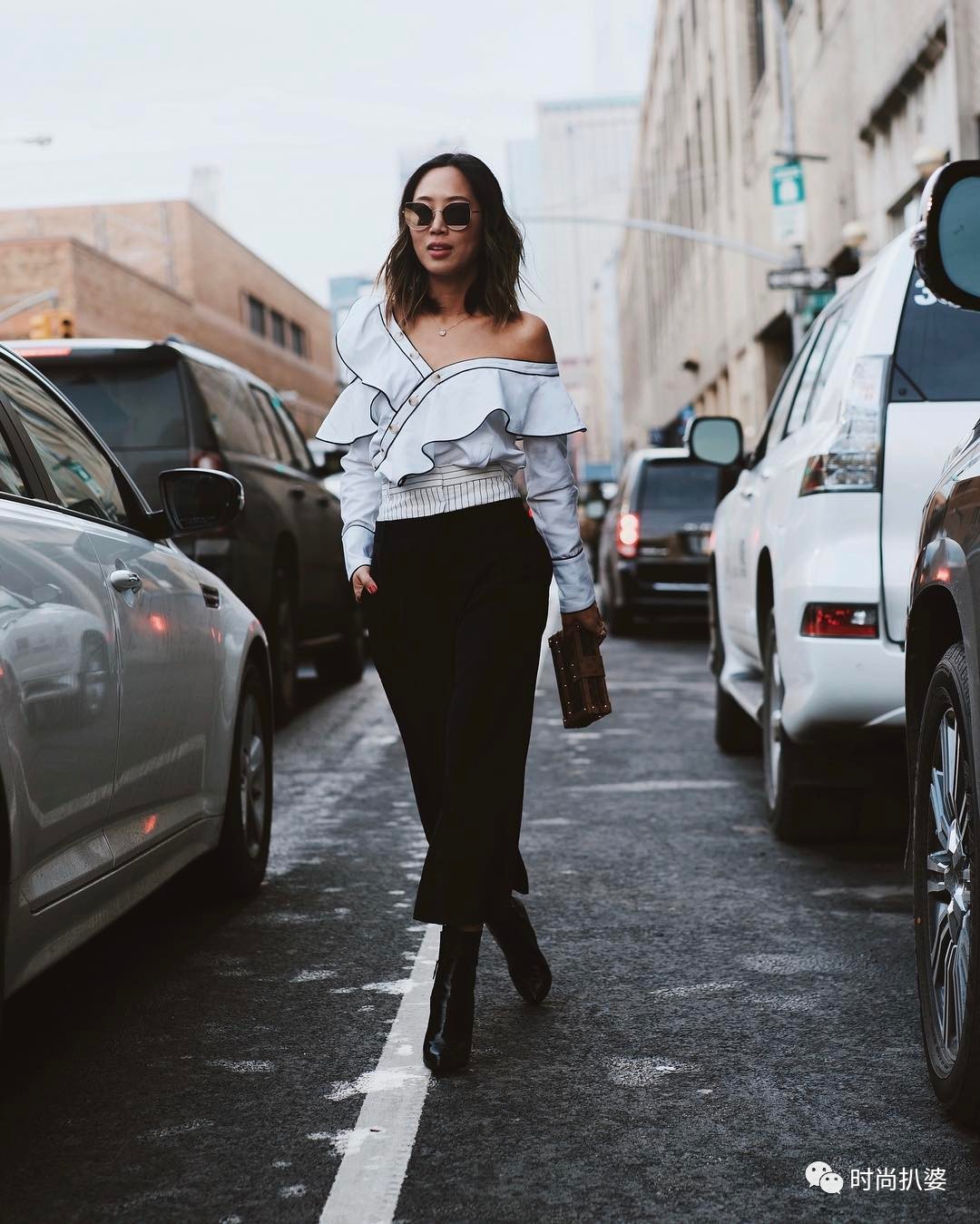 其中最当红的V字斜肩就属时尚博主Aimee song身上穿得这款self-portrait的V字荷叶边露半肩的款。
