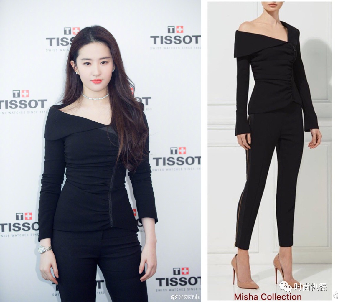 前几天刘亦菲就穿了一款misha collectionV字大领子斜肩,不过刘亦菲没有拉下肩。