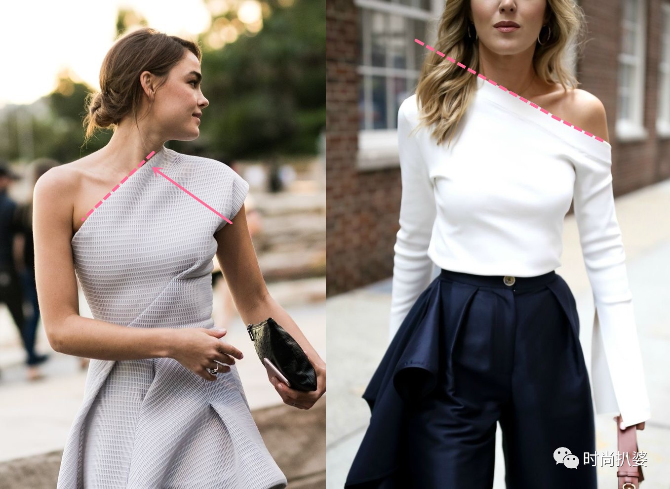 选择这种不对称的斜肩也要注意斜肩线与脖子的距离。