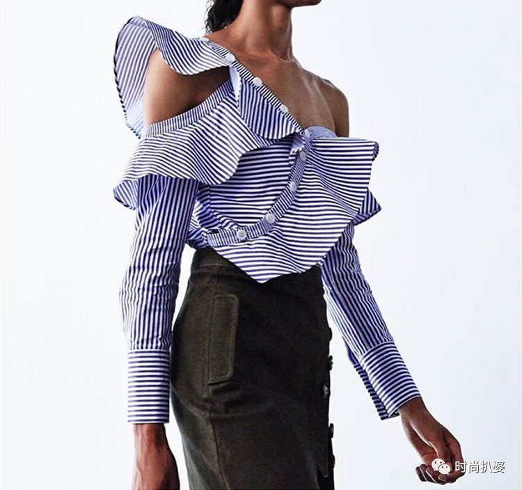 比如这款融入了不对称设计,荷叶边,假大领子的集合了今年所有的流行元素,并且不累赘很少女的斜肩上衣,各个快消品牌包括音符,Topshop等都出了类似款。▼