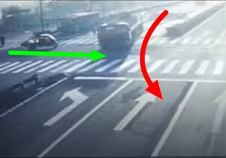 眼看着可能会撞上正在左转的电动三轮车,肇事的重型平板车司机一把方向往左打去,成功避开了电动三轮车。