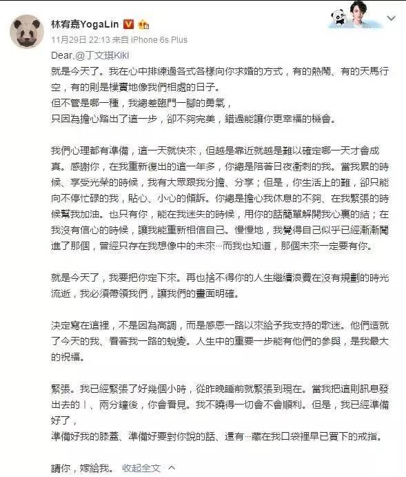 林宥嘉在微博上发长文向女友丁文琪求婚,字字真心,最后那句“请你,嫁给我”简直苏炸了!