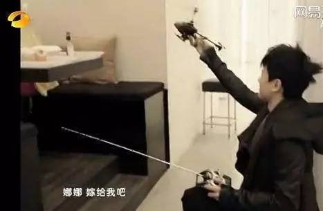 张杰求婚的时候把戒指放在了一架迷你直升机上,在屋子里操控着直升机飞来飞去,谢娜还一直怕他打到自己。