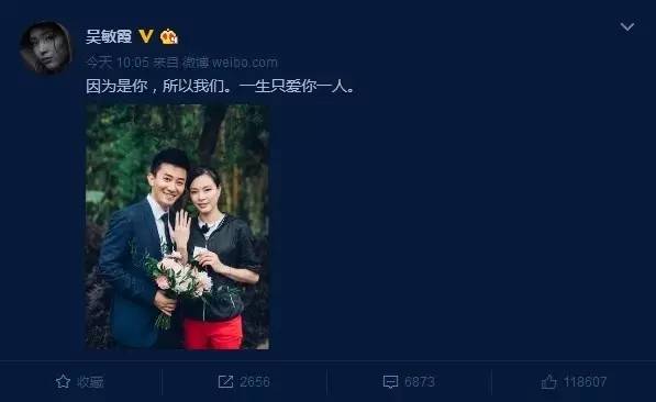 随后吴敏霞在微博上晒出钻戒,说道:因为是你,所以我们。一生只爱你一人。