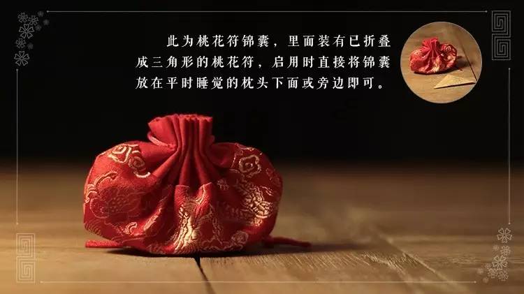 沐浴或泡澡后将装有折叠成三角形桃花符的红色锦囊放到平时睡觉的枕头下面或旁边,床头柜内也可以,但枕头下效果更好。