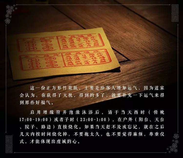 正如“拜太岁”是中国道教文化的一个内容,也是我国民间一种化煞消灾、祈福纳吉的传统习俗,请增缘符,同样是一种非常光明正大的纳吉方法。