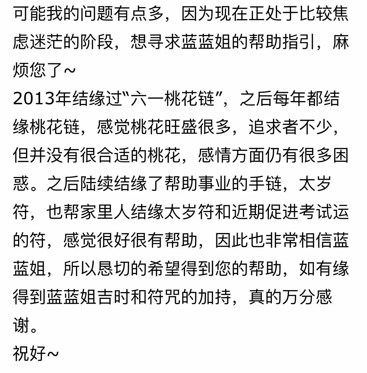 我在2013年开始推出第一期的桃花链,而后每一年都会推出两期桃花链子,这么多年,也帮过不少客人,但是,有些客人会有天生的感情问题,不仅仅是招桃花,她们还需要增加正桃花,去除恋爱或者婚姻中的不良吵架或颠簸,我都会劝她们抓住好的年份,抓住自己的命盘特点,但始终有一些原本就存在的瑕疵,就像躯体本身的问题,不能光靠锻炼,还得需要后天的一些帮补。这个时候,我都会给她们用上一些桃花符咒。
