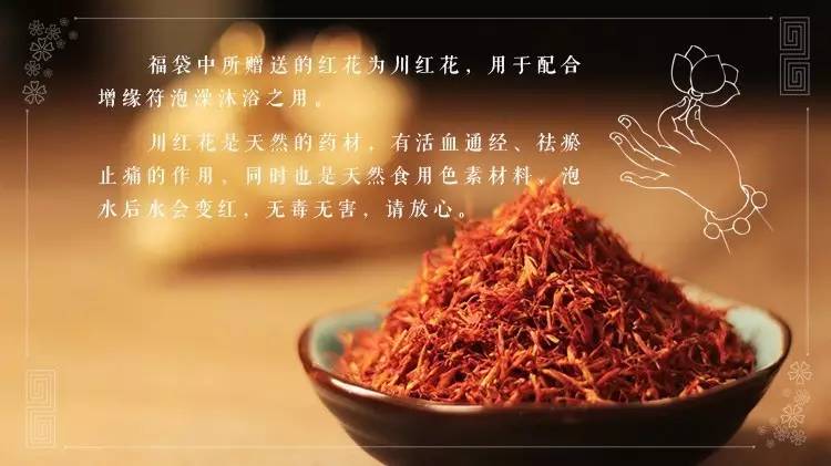 川红花一份(赠品,沐浴洗澡时用,只需取一点,为的是沾染红花之气,无用量要求);
