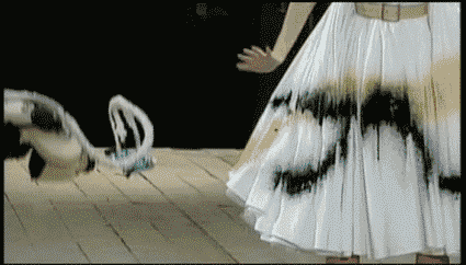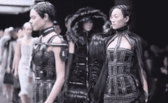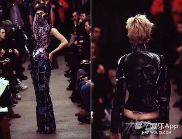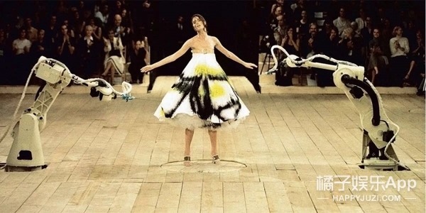 1999年,McQueen在舞台上设置了两个喷漆机械臂,模特穿着穿白的衣服走上舞台,站在机器中间接受颜料的洗礼,即场变换出新容,展现出他几乎惊人的想象力!