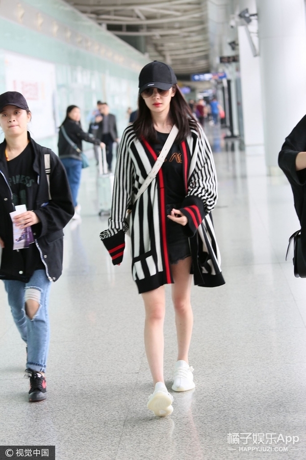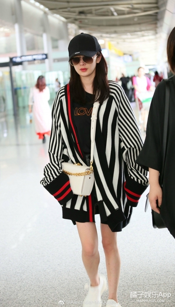 杨幂同学也同样选择了白色的包款,出行必备的黑色棒球帽加条纹针织外套脚踩运动鞋,一身光看着就舒服到不行!