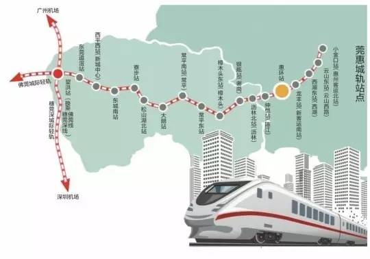 莞惠城轨2009年5月10开工建设,是东莞至惠州城际轨道交通,西起穗莞深城际铁路的望洪站,向东经东莞市的望洪、道滘、南城、东城、寮步、松山湖、大朗、常平、樟木头、谢岗等镇(区),惠州市的沥林、陈江、惠环等镇(区),东至惠城区小金口站。莞惠城轨总长约100公里,设18个车站,设计运营时速200公里,高峰期6分钟一班车,城轨建成后,两市城区行车时间有望压缩至30分钟。