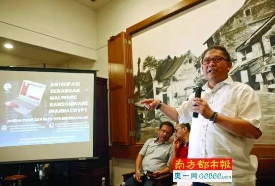 5月14日,印度尼西亚雅加达,印尼通信部长鲁迪安塔拉在新闻发布会上介绍“想哭”病毒攻击的情况。新华社/路透