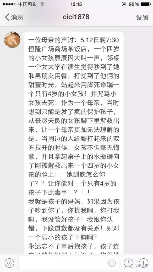 据孩子的母亲宋女士说,5月12日晚上7点30分左右,她陪着4岁的女儿辰辰上完了舞蹈课。辰辰吵着说饿了,宋女士就跟另一位家长带着两个女孩到学校附近的恒隆广场里吃饭。在饭店里,两个同龄的孩子在一起玩耍,邻桌的女大学生嫌孩子吵闹,奔向宋女士的女儿辰辰踹了一脚。