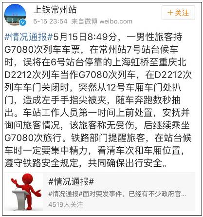 5月16日,常州网警对昨天列车门夹人事件情况进行通报: