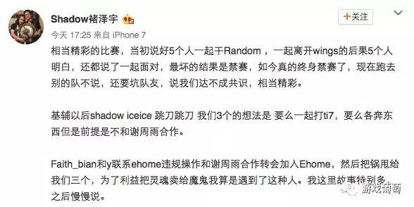 同时,shadow发布微博,回应了对这件事的态度,称“Faith_bian和y联系ehome违规操作和谢周雨合作转会加入Ehome”。