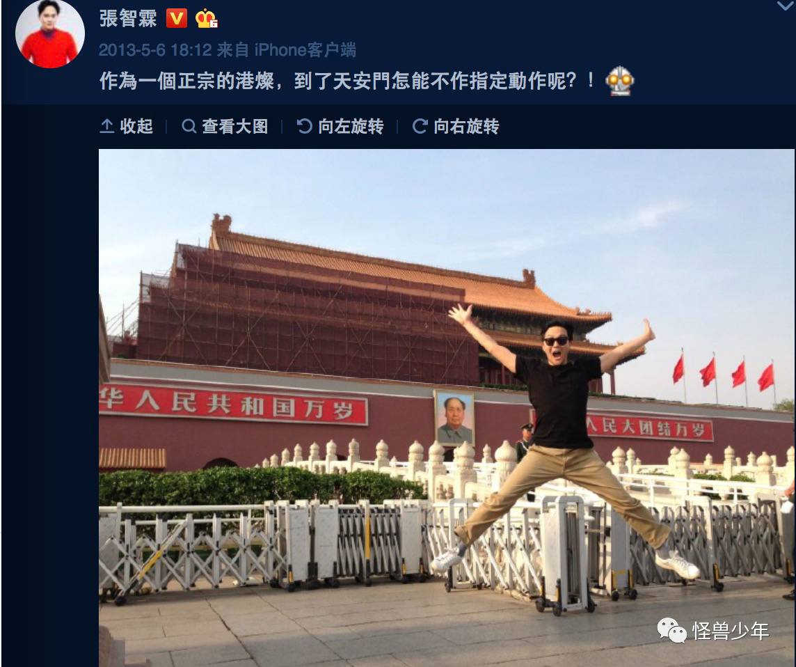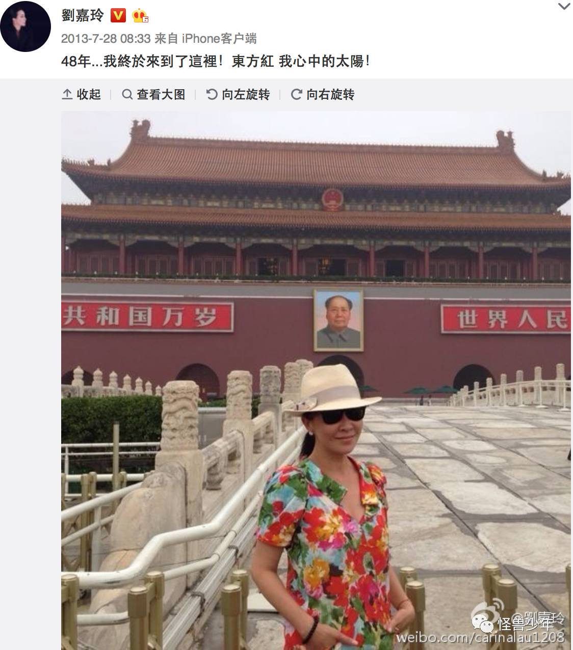 当然,明星拍照也不一定全是包场,那么大的西湖景区,刘嘉玲也不可能自己承包完。所以拍照选择合适的角度就显得很重要了。2013年7月,她在北京天安门前的照片就很有技术含量。