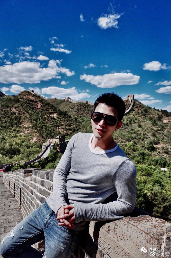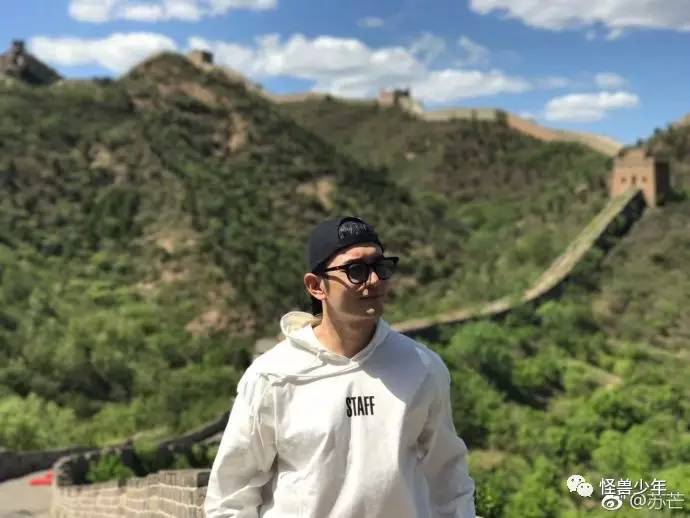 黄教主这一身打扮超级有感觉,鸭舌帽反戴,黑超遮面,外搭白色卫衣,背景虚化后,连长城都没他抢镜了。