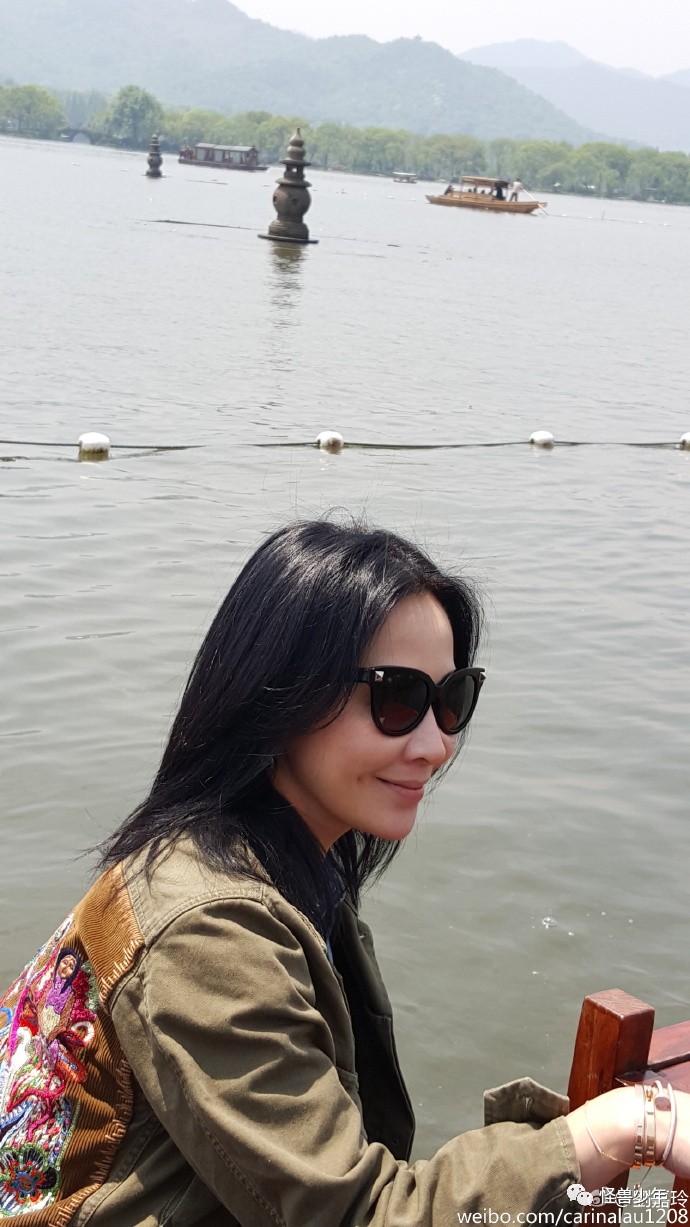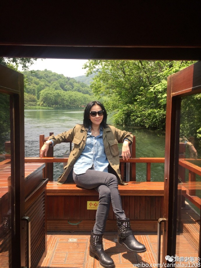 还有一张刘嘉玲坐在船头,身后的湿地绿意盎然,刘总这一身打扮简直炫酷爆了。