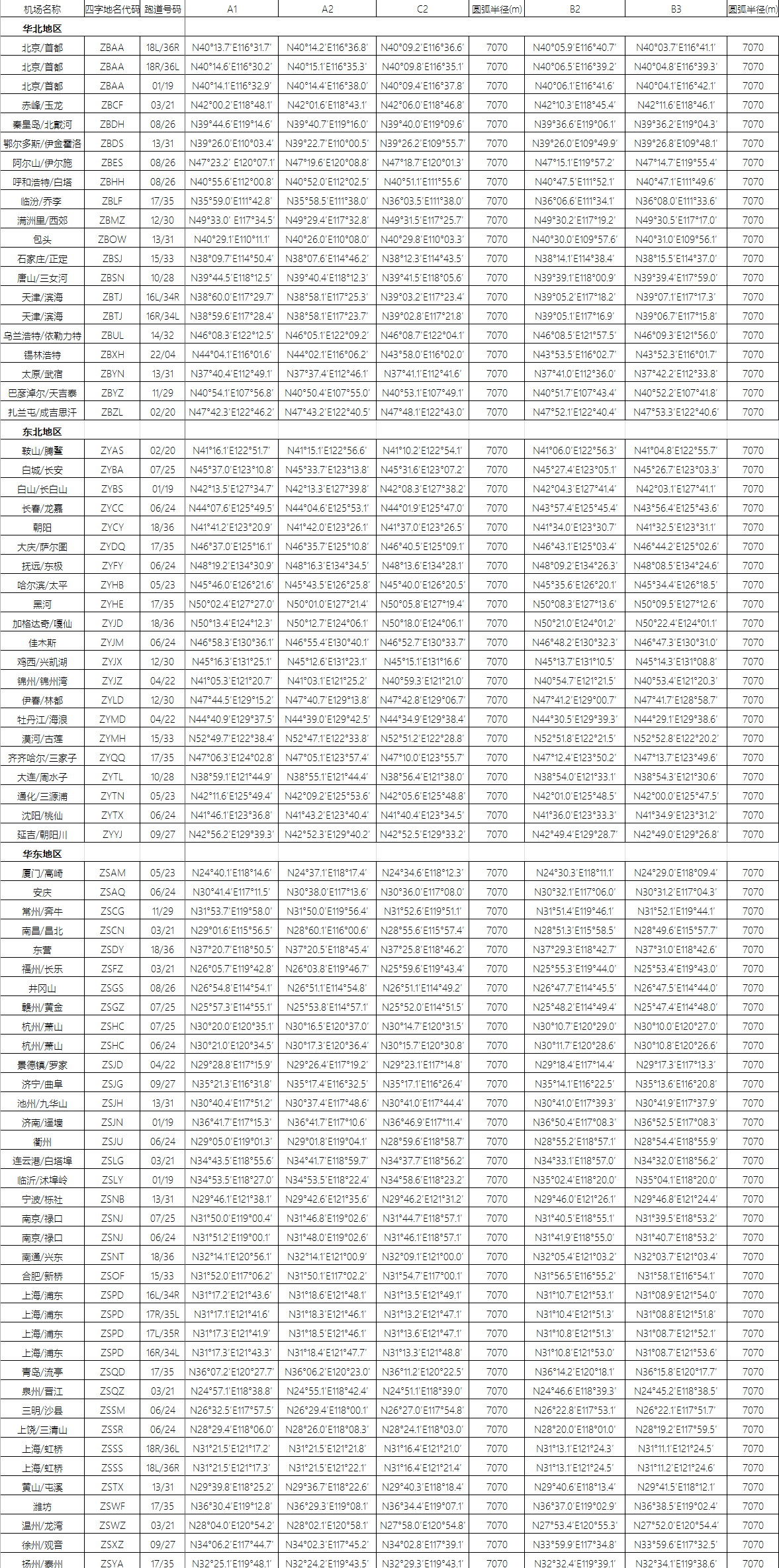 为了得到这些数据,我在民航局网站上实名注册了一个账号,然后就看到了一堆让人眼花缭乱的经纬度划分。155个机场的数据怕吓着你,所以我这里就截图了一部分图,已经让人眼晕了。