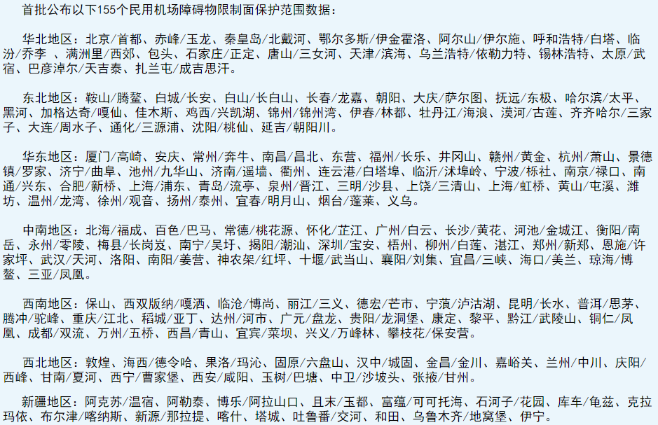 另外,昨天下午,民航发布了首批155个机场保护范围数据,这些机场包括: