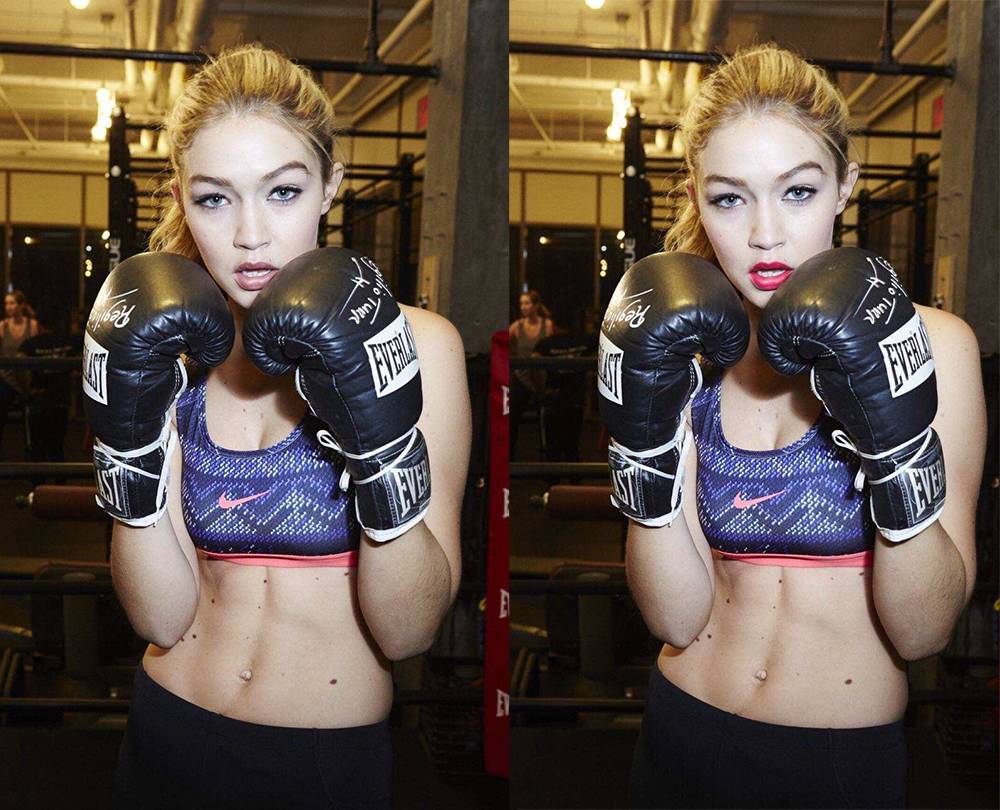 ▲姐给Gigi 涂上大红唇之后,是不是感觉红唇妆+健身服的Gigi有点作?