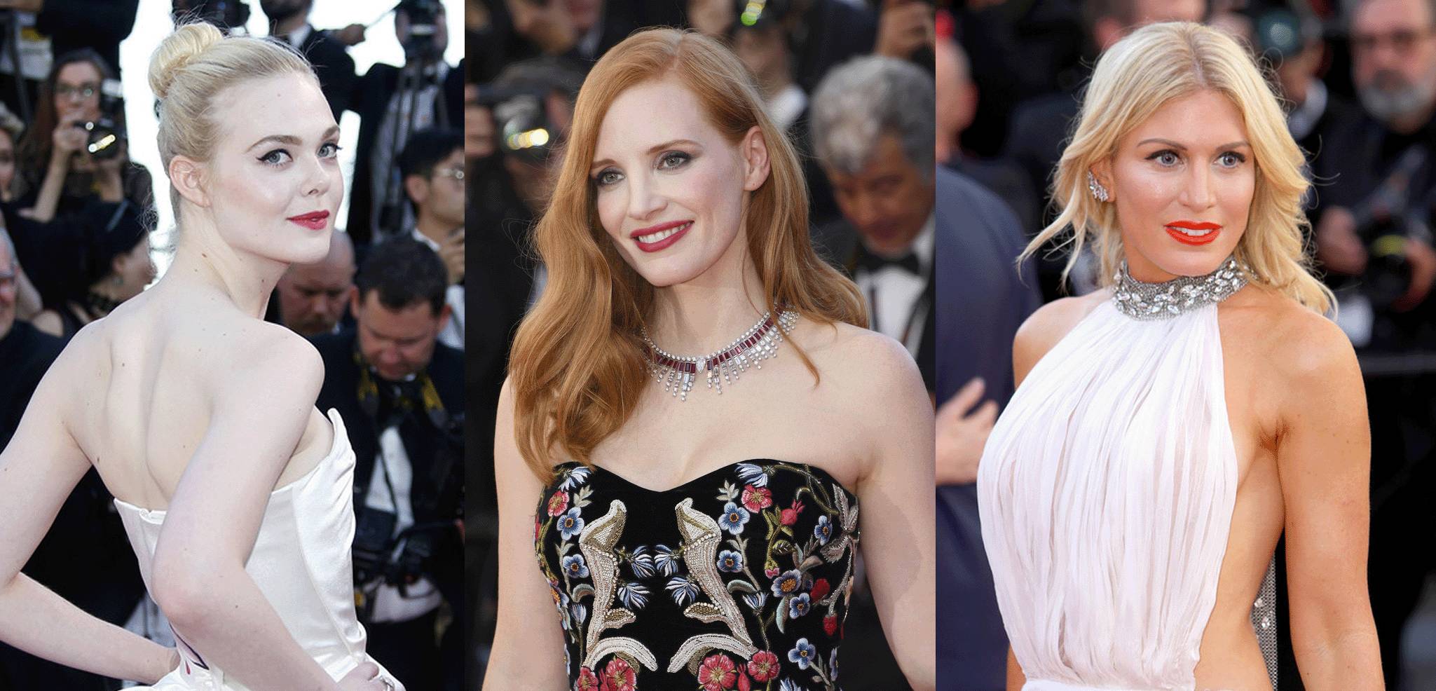 ▲今年戛纳红毯上的女星们,(从左至右:Elle Fanning, Jessica Chastain,Hofit Golan)
