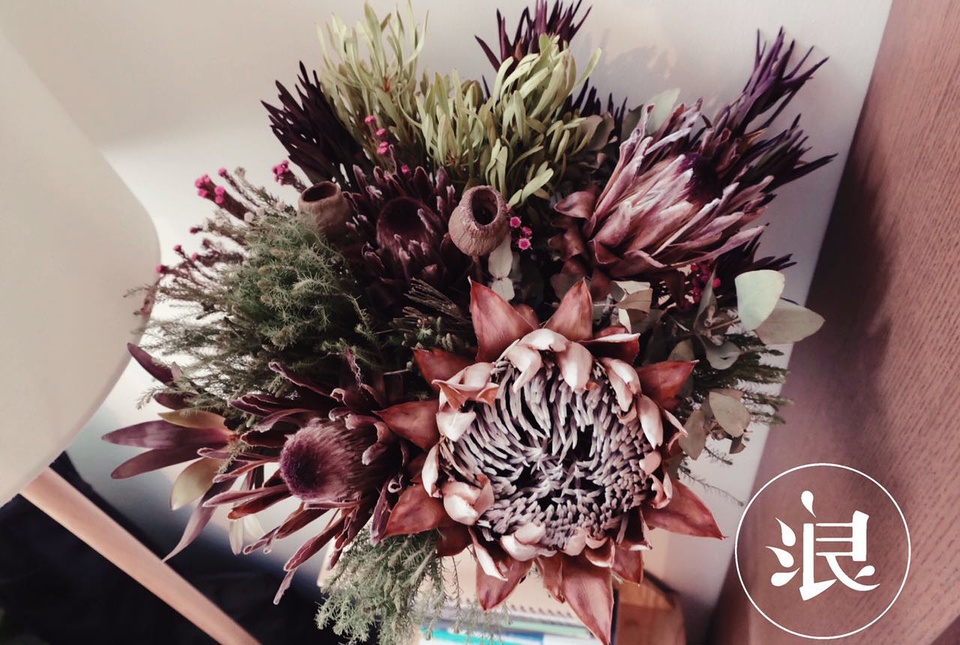 帝王、公主、木百合这些又能做鲜切花又能做干花的品种是好看又节约成本的救星,一大把加在一起大概两三百块钱。回家先当普通鲜切花放在花盆里,看它们有凋谢迹象就拿出来,把根部绑住倒挂起来,风干几天之后,花的形态不会怎么干瘪,颜色也仍然好看。可以几个月地一直摆下去。
