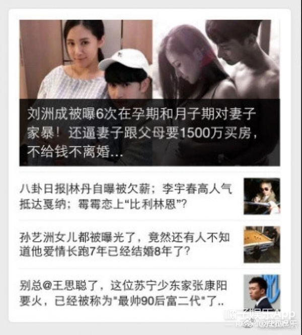 5、【刘洲成被曝6次在孕期和月子期对妻子家暴!还逼妻子跟父母要1500万买房】看娱乐新闻看久了,渐渐地悟出一个道理:真正重磅狗血大新闻永远是当事人自己曝出来的!!!今天至上励合成员刘洲成的妻子林苗发了篇微博,不但宣布自己已经和刘洲成离婚,而且还控诉刘洲成家暴。除了家暴和流产,林苗还爆料说,刘洲成这个“好爸爸”形象也完全是装出来的。刘洲成跟林苗说,自己的构想是住别墅,开超跑,住在90平米都不到的房子会被人看不起;还让林苗跟自己爸妈要1500万……