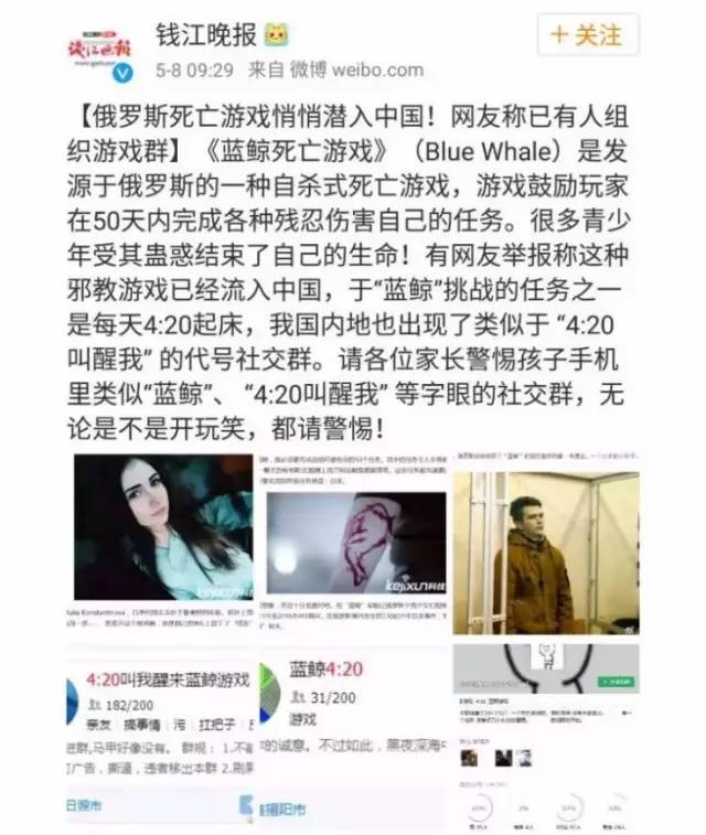 国内也发现了这款死亡游戏的踪迹,小编此前也发文提醒过,尤其是家长要特别注意孩子的QQ群等社交群组。→很危险!俄罗斯“死亡游戏”传入中国,腾讯封掉10多个群