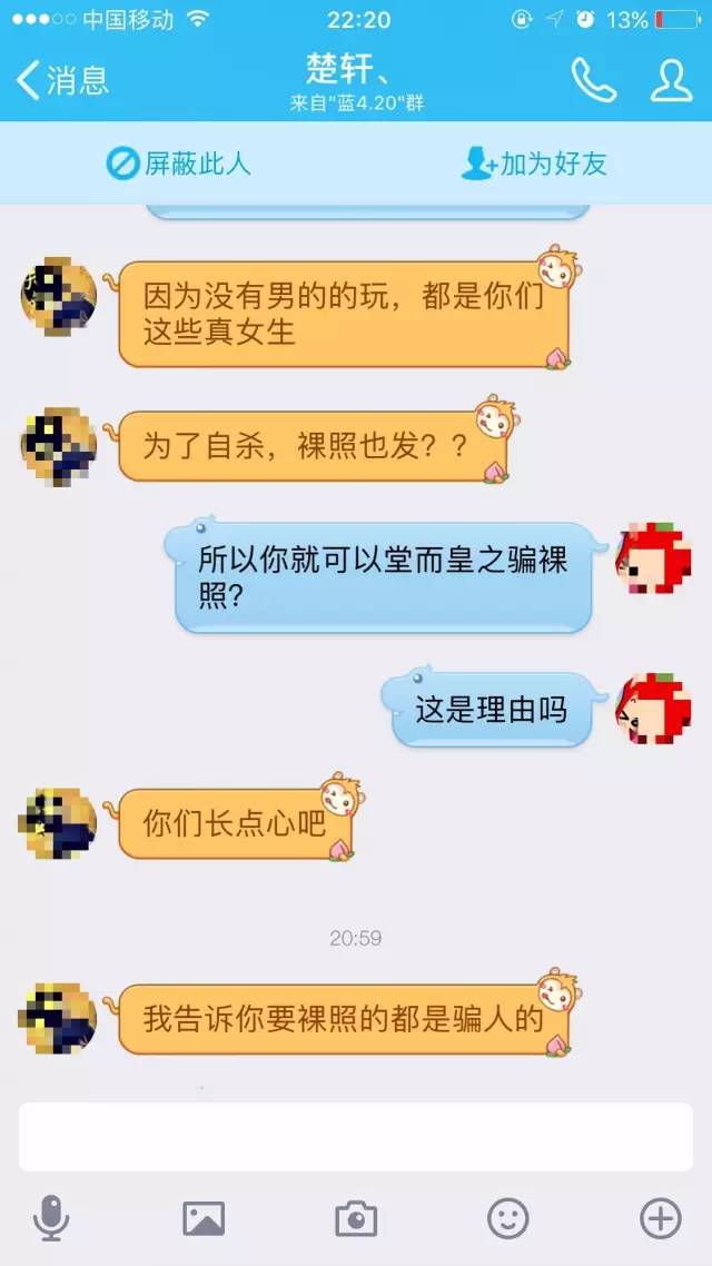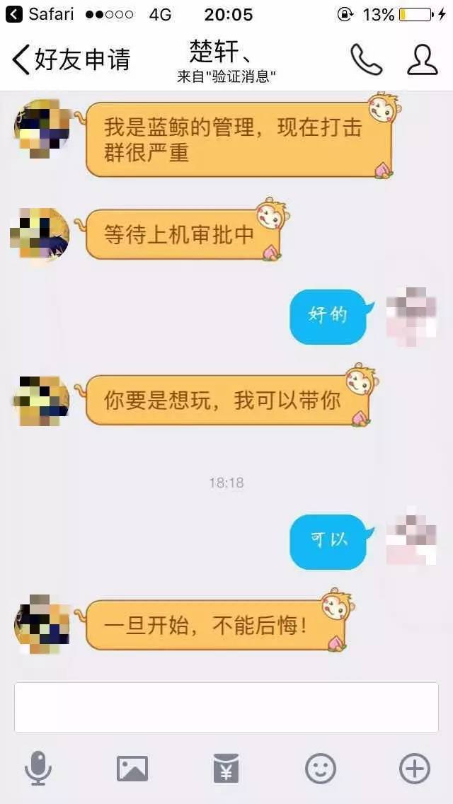 随后,记者同样添加“楚轩”询问进群一事。交谈中,“楚轩”承认他并没有在真正的蓝鲸游戏群中,并坦承“要照片的都是骗子”。他还透露,提出想玩蓝鲸游戏的人以女性居多,此前他已经以“带人加群”为由,向多名表示好奇的女性用户索要过裸照。