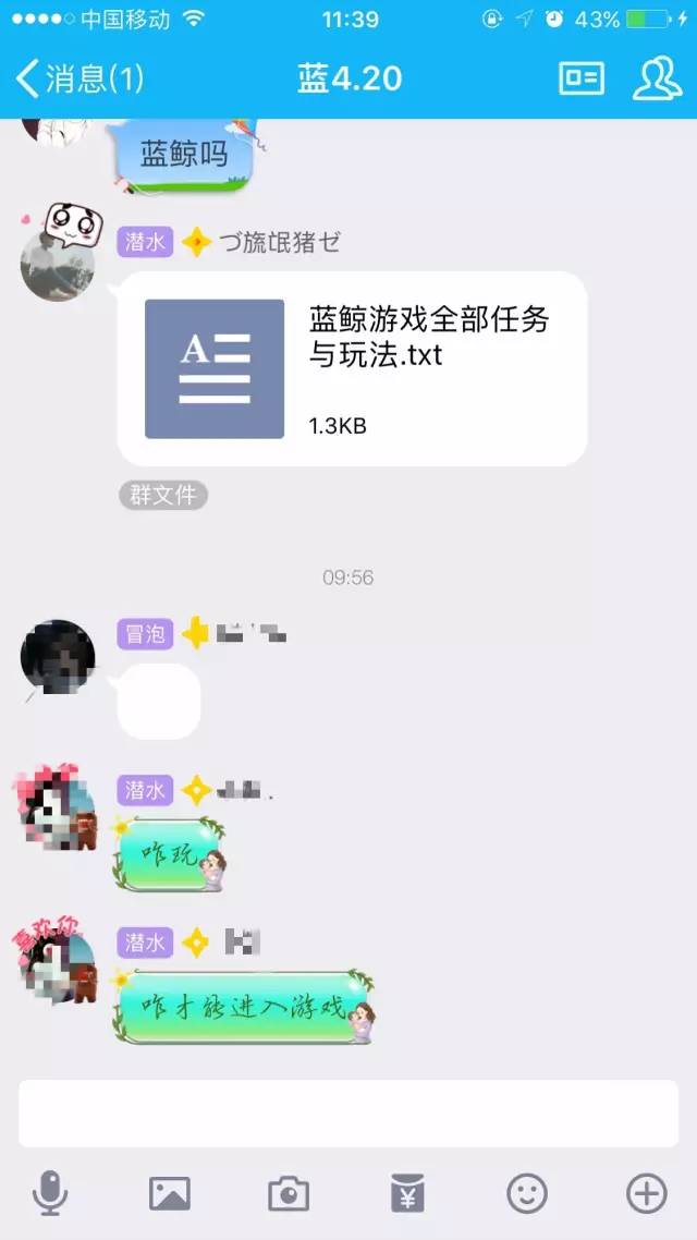 记者随机添加部分群组后,发现群内并非都是游戏参与者,多数为对蓝鲸游戏表示好奇的用户。但在群聊界面中,有人不定时发布“蓝鲸游戏全部任务与玩法”的文档,并解释说“是给想玩的人看的”。