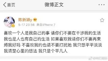 事情一出,粉丝反应确实很大,部分人骂那个女生是想炒作,颖哥是被利用了吧!可是没想到陈新颖昨天大半夜发了微博,“喜欢一个人是我自己的事,请你们不要在干涉我的生活。”